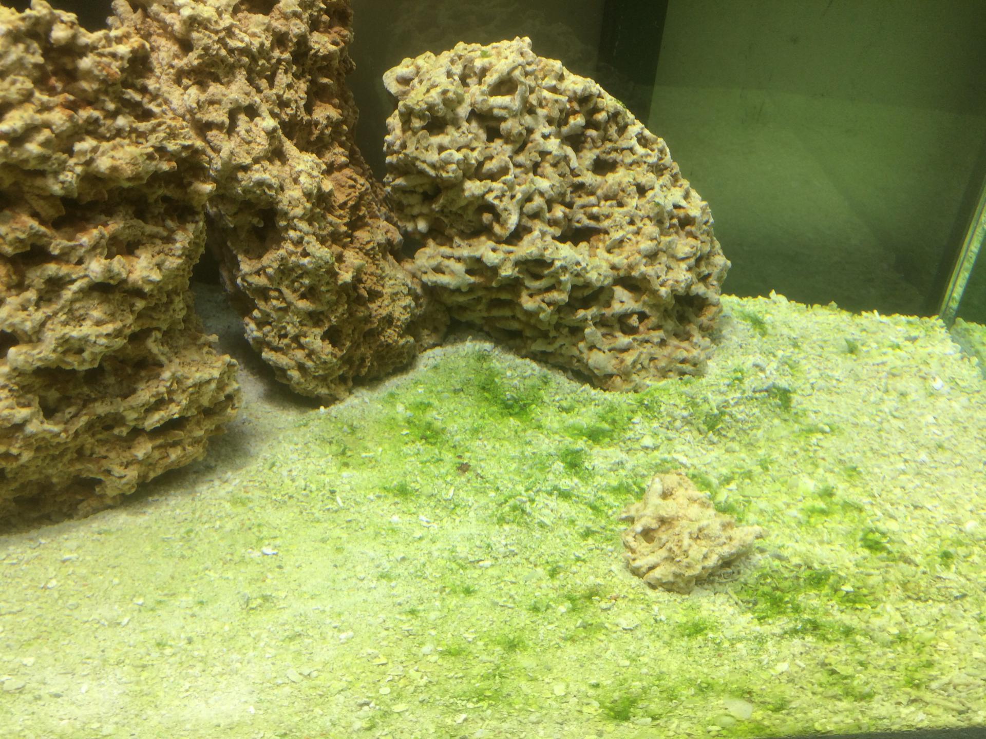 Камни у вас чистые, это немного странно, конечно, но честно говоря вид морских камней под пресным светом сам по себе странен, поэтому остановимся на том, что все у вас нормально.