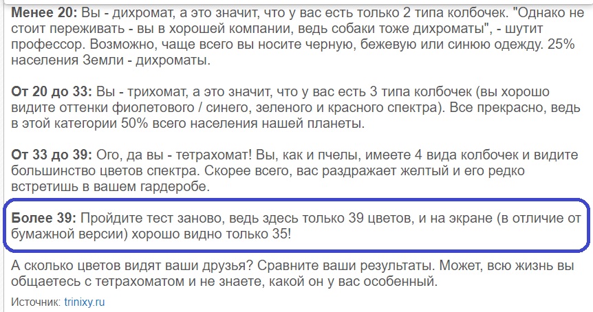 Кстати. О птичках. Я здесь сходу увидел 38 цветов. Но - это ни в коем случае не значит, что я тетрахромат. Это говорит о том, что небольшой шанс этого есть. Ну или о том, что у меня хороший монитор