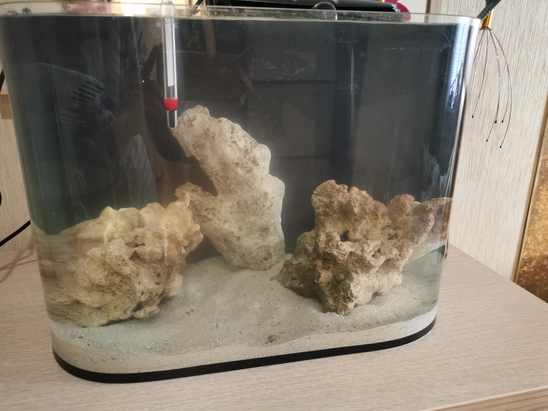 Вчера засолила, соль Prime для рифа, и засыпала 2кг живого песка из аквариума. Сегодня добавила 2 кг живого песка и 5 кг живых камней. Работает помпа ferplast, не очень мощная, 600 л/ч и рюкзачек fzn3. Свет едет, надеюсь будет через пару дней - chihiros 451M, 27 ватт вроде бы.