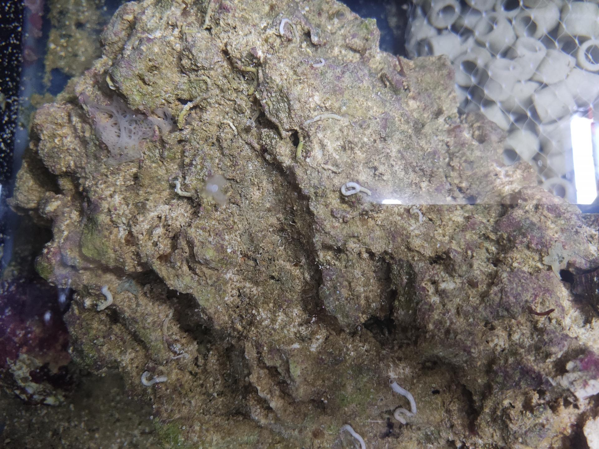 Они в темноте в специальном аквариуме лежали, с камнями, в магазине. Хотя свет там включается тоже. Червей в них мама не горюй, штук 10 точно, от маленьких до огромных)) ещё офиурка и Астерины. Водорослей нет, но на 2 камнях есть красный какой-то налёт с одной стороны, и зелёный на другойПотому что это не ЖК, максимум пару месяцев полежавшие в системе СРК.