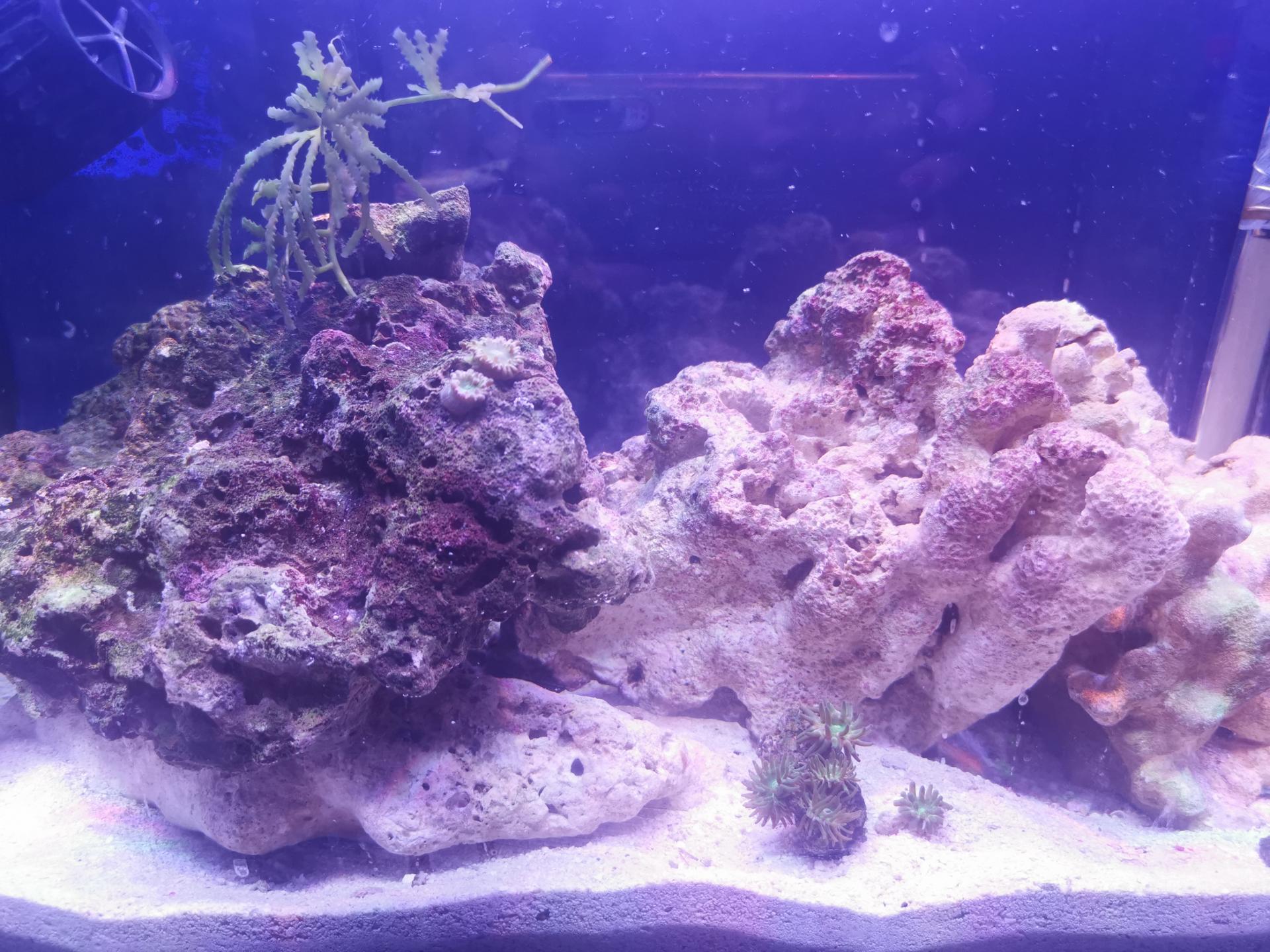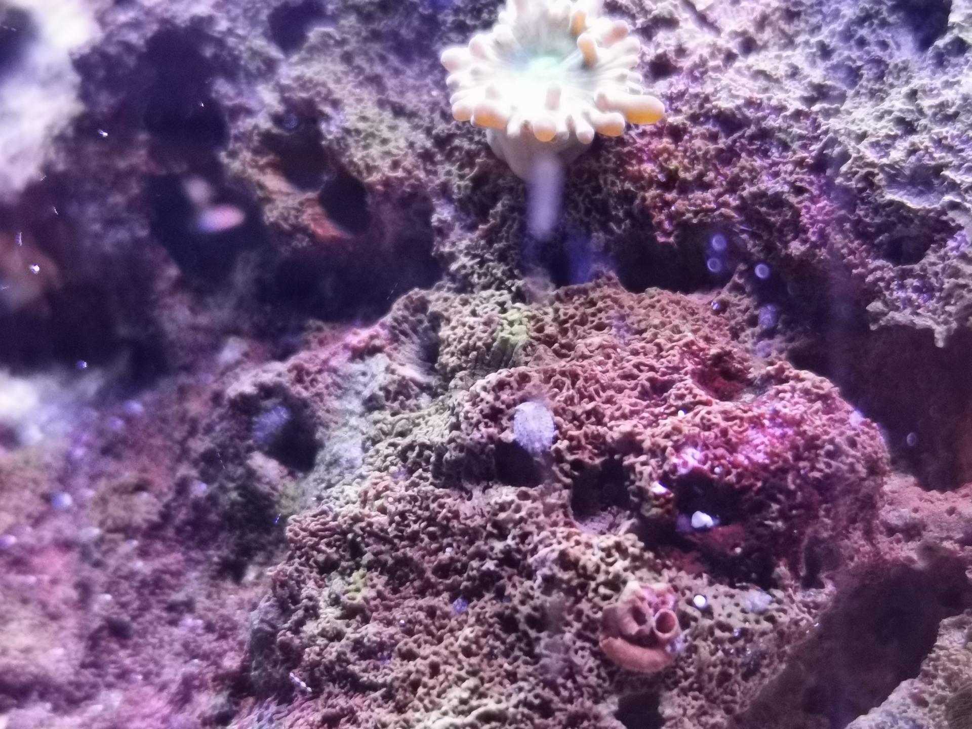 Также продавец не знал (!!!) названия кораллов я так понимаю. Потом сказал что зелёный вроде дискосома меховая, а второй клавуллярия или корнуллярия (забыла). Они чувствуют себя оба хорошо, сейчас фото после подмены воды и небольшого шебуршения камней, немного испуганные, а так прям мне кажется им хорошо