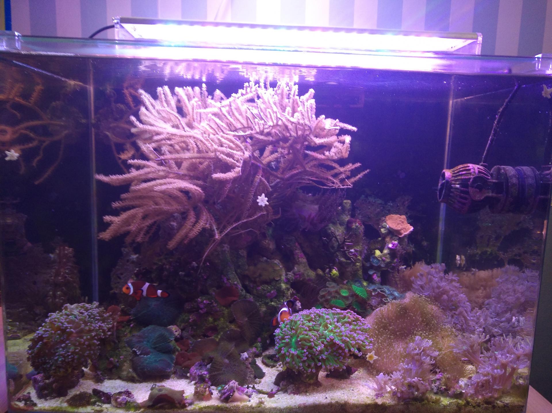. До форума я был неприятно озадачен, видя высокие цены на кораллы и морских рыб в магазинах в сравнении с пресными гидробионтами, с учетом моего весьма скудного бюджета на любимое хобби. Но благодаря "барахолке" и знакомству с моряками из ближайших окрестностей я постепенно заселил свой кусочек океана различной мягкотой (горгонарии, дискосомы, родактисы, рикордеи, зоантусы и политои, бриареум, антелия, клавулярия папайя, саркофитон и ксения). Вместе с мягкими кораллами заселились огненные черви, черви-спагетти, губки и астеринки. Позже появились улитки (стромбус, трохус, колючая астрея), тихоокеанская креветка-доктор, красноногий рак-отшельник, два клоуна оцелляриса и собачка-биколор. Прижился и поделился песчаный анемон. Несмотря на "дешманский" светильник я решил попробовать содержать ЛПС и простые СПС. На удивление прижилась и растет эуфилия-икра, австралийская монтипора и красная монти (название не знаю), держится красавец фавитес ультра грин. Одновременно с этим постоянно происходят "волнения и шторма на море"