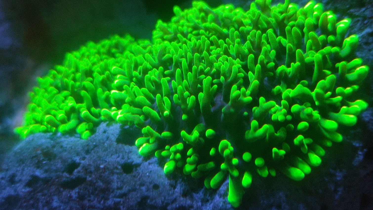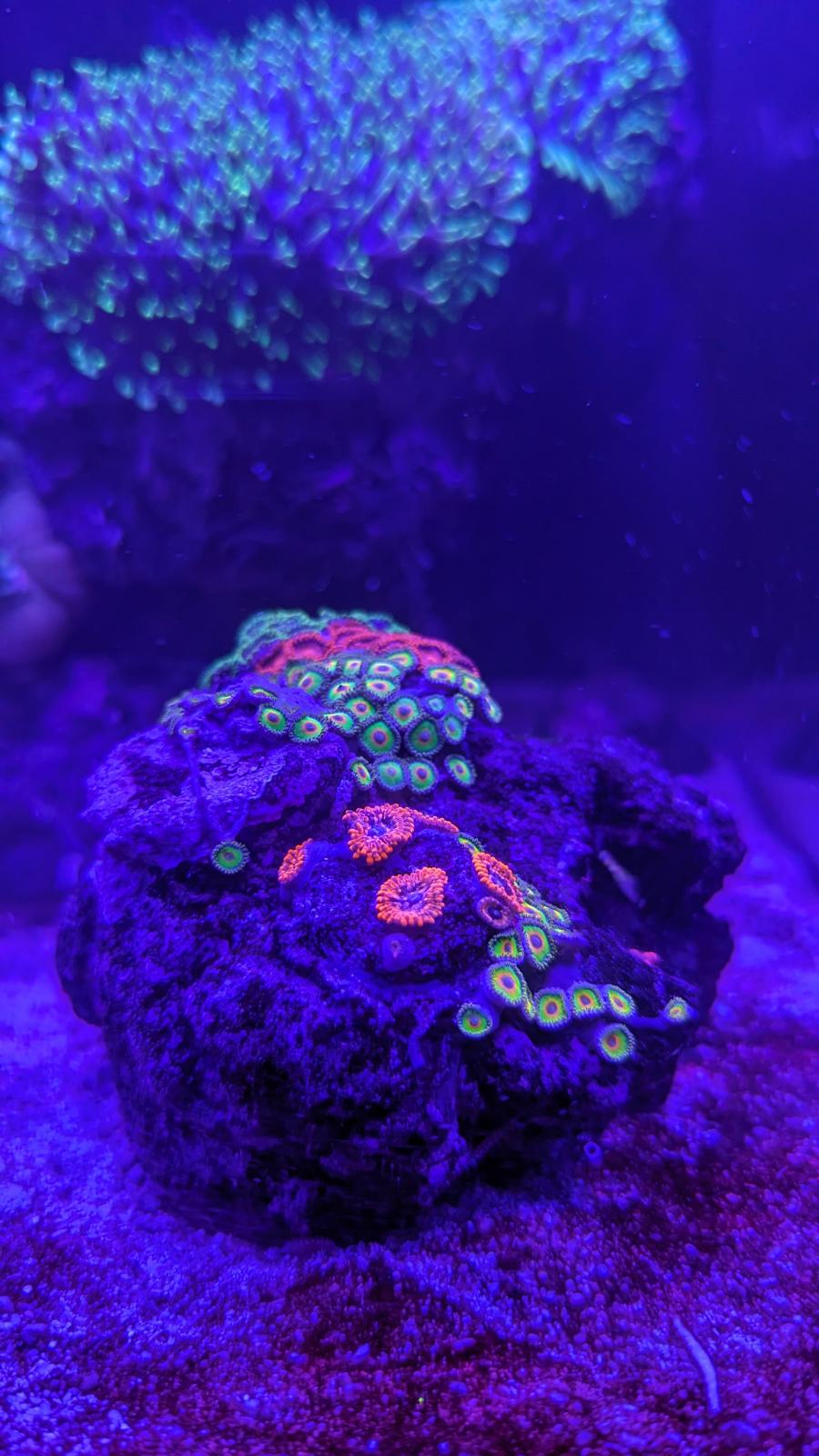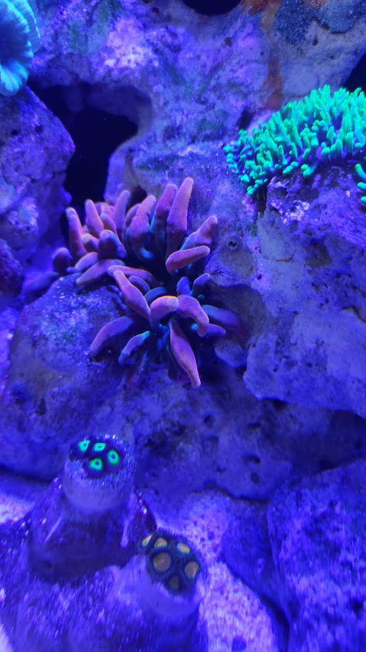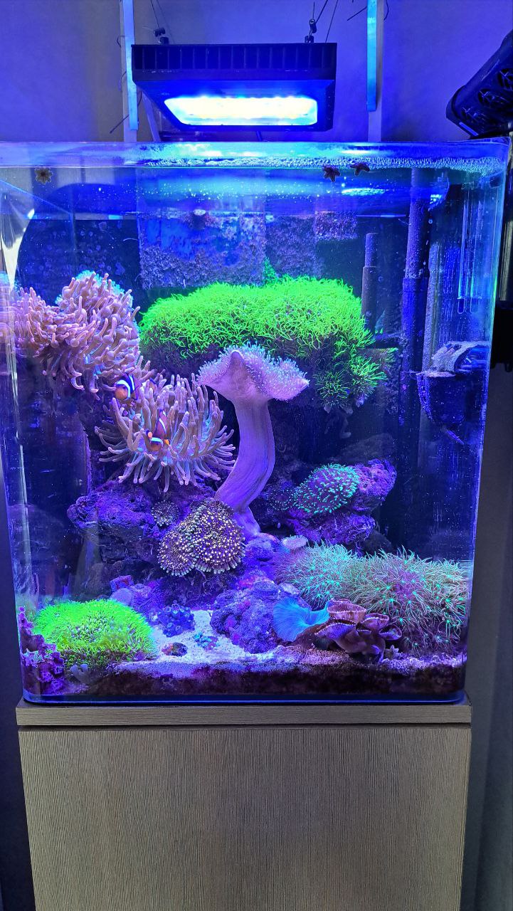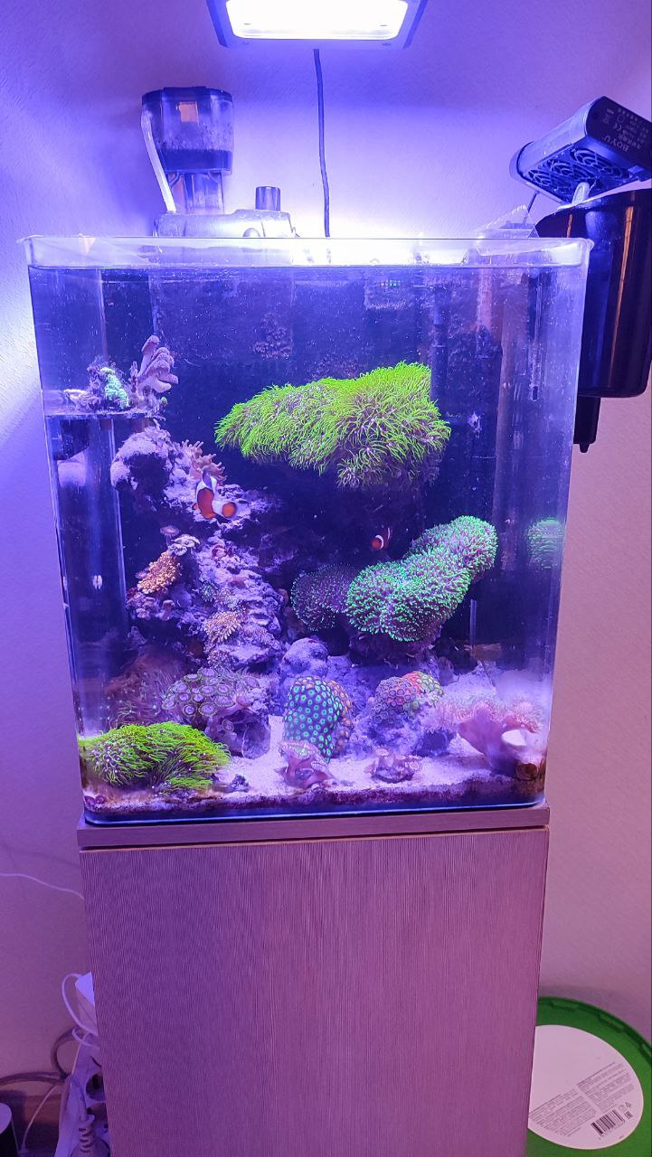 Давно не чего не выкладывал, уже были и первые потери, и разочарования, но всё отлично и риф по прежнему радует меня своей красотой, по немногу закупаюсь кораллами, начиналось всё с мягкоты сейчас есть как LPS так и SPS, еженедельные подмены меняю 10 литров, всё себя отлично чувствует, но появилась новая проблема, интересных кораллов ещё много, а место заканчивается, добавляю добавки для цвета и аминокислоты marinekraft, извините за качество фото желтая линза котцанная, появился автодолив и пенник, казалось бы аквариум не большой, но за сутки испаряется литр.