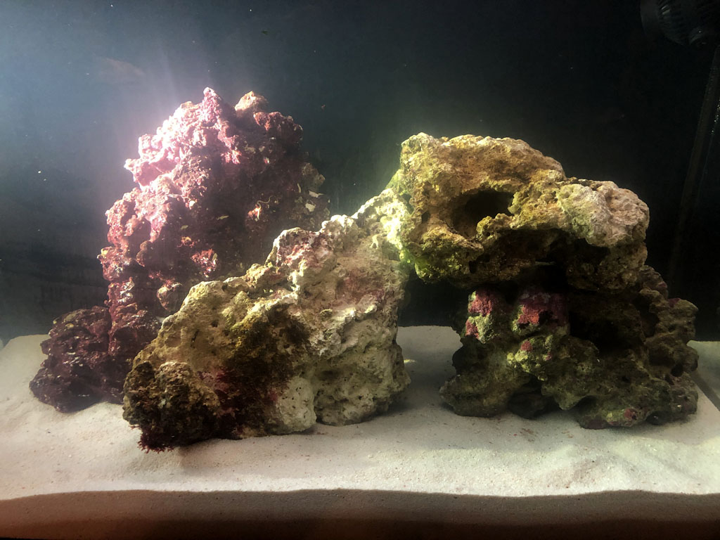 Разместил первый ЖК (найден в одном из аквариумов АкваЛого) и засолился. Засол был по рекомендациям "специалистов" путём заливкой холодной воды из под крана и добавлением специальной соли Red Sea в область перемешивающей помпы.