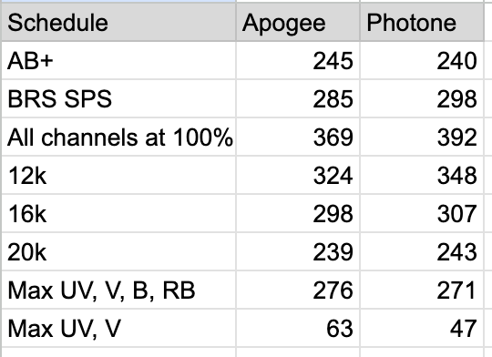 - При замерах в коротковолновой области (<430нм) Photone становится менее точным. Допускаю, что при замерах в области 380нм расхождение будет еще больше. Тем не менее, это не особенно важно для нашего применения, т. к максимум освещения у нас все же на синем и голубом, а не на фиолетовом и ультрафиолетовом