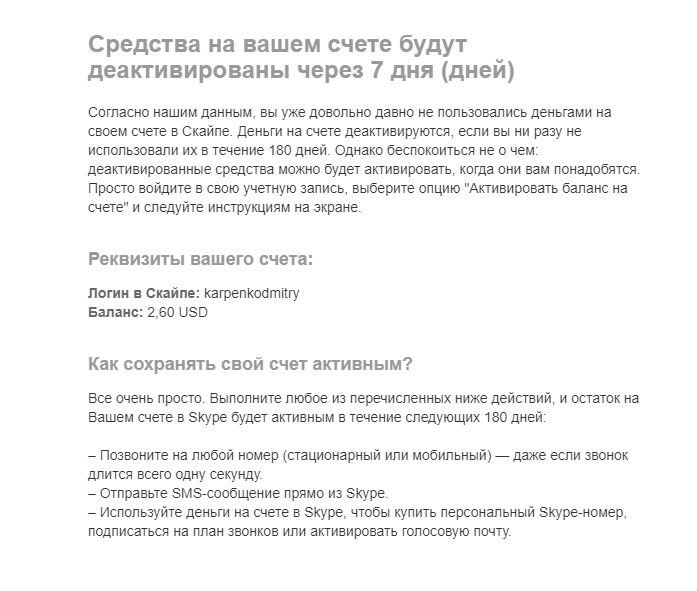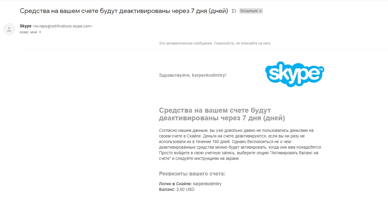 Давным-давно я положил на свой счёт Skype немного денег. С тех пор там остался кусочек. Вчера получаю вот такое письмо, показываю скриншот: