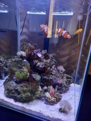 ~2 кг грунта Seachem и ~25 литров засоленной воды на дистилляте из леруа вперемешку с домашним осмосом (у осмоса TDS 28 что-то я побоялся на ней запускать).