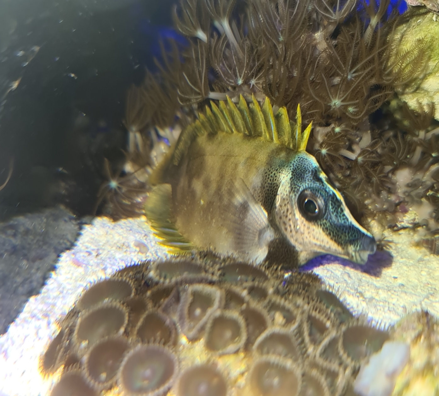 в общем ваннами и пересадками вроде как победил болезнь у лисы все точки сошли, стала активно питаться, с учетом возможной вероятности что это таки крипт видимо месяц будут все жить в карантине. Клоун по прежнему с наростом, буду требовать замены (явный дефект)
