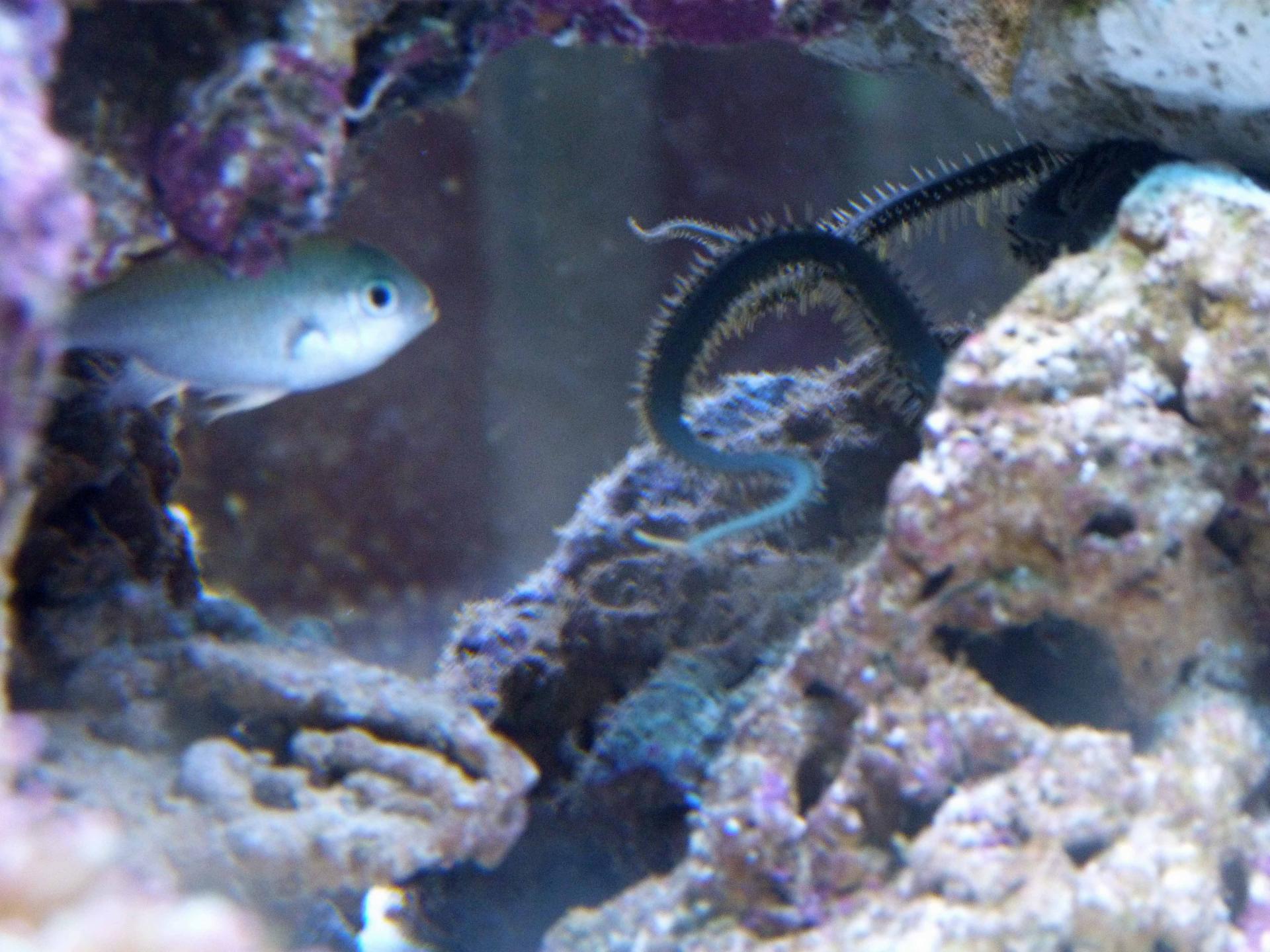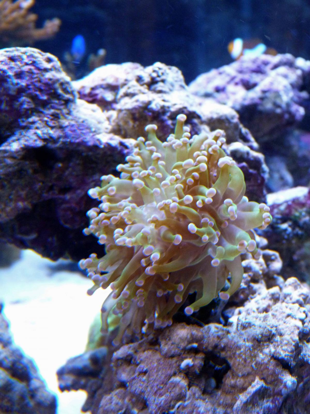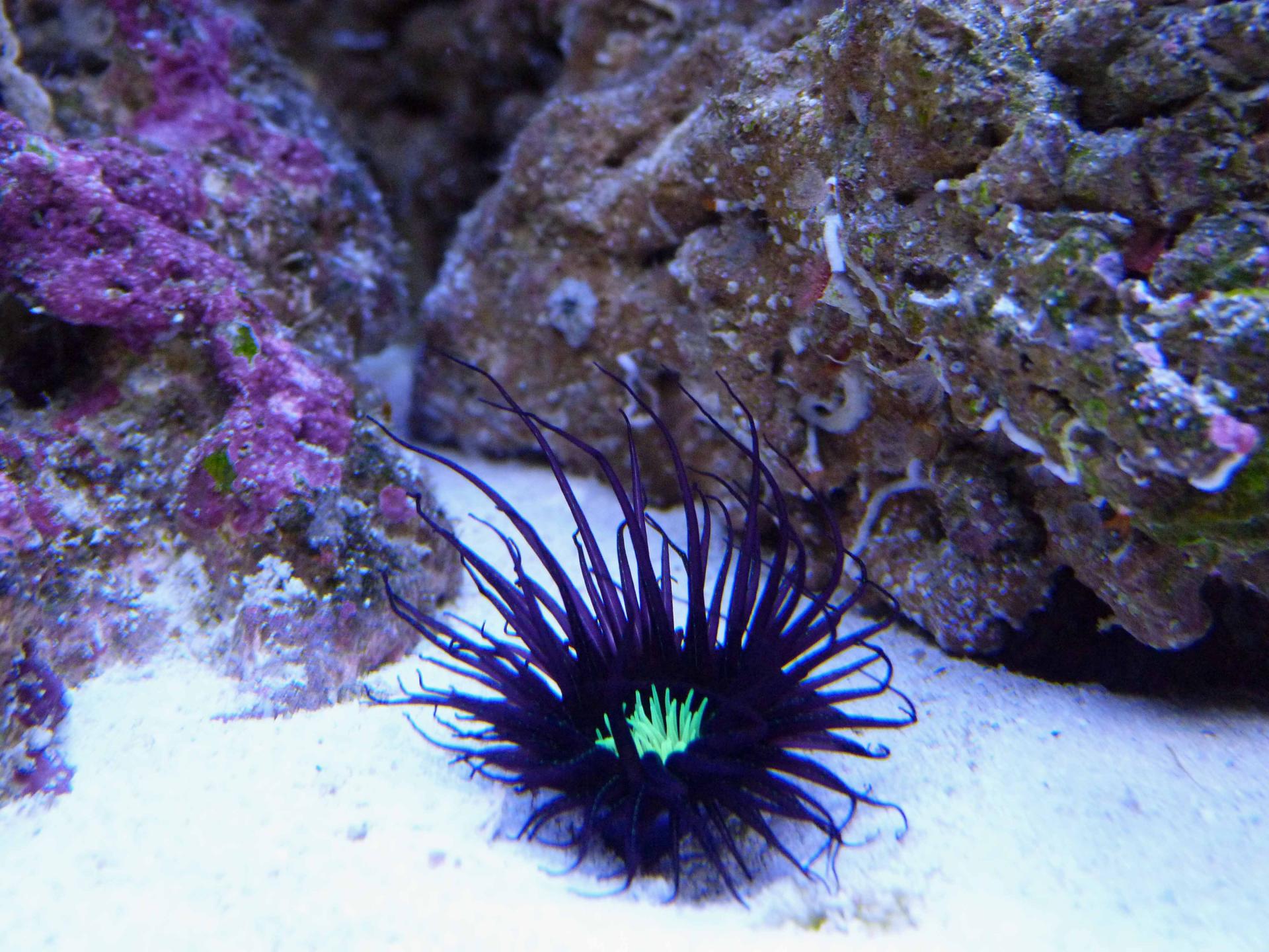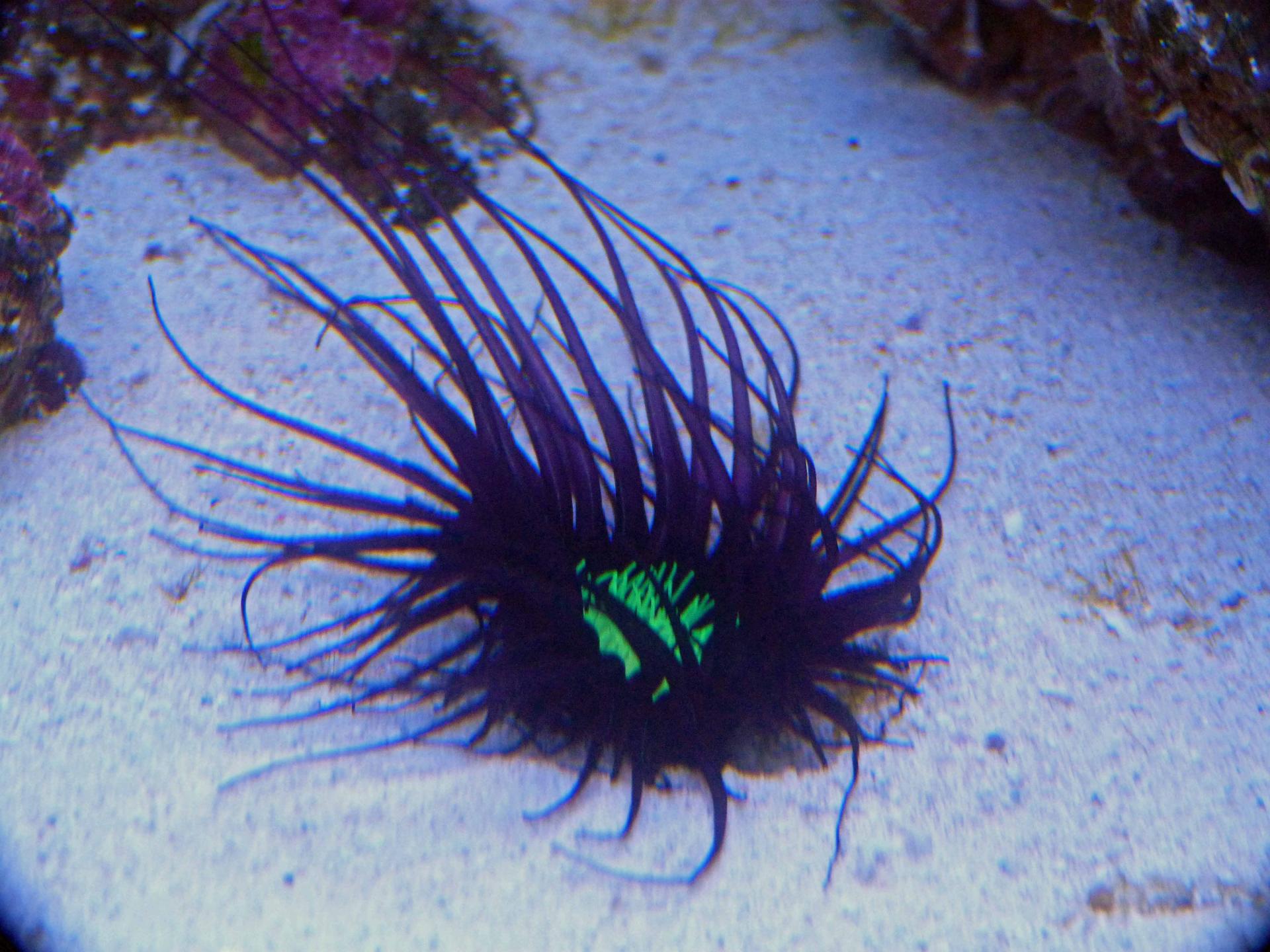 Это последнее приобретение: цериантус. Пока еще не совсем освоился. На фотографии конечно мне не добиться реальной красоты. Он глубокого черного цвета с еле заметным фиолетовым оттенком и яркой зеленой флюоресцирующей серединкой. Оочень контрастно.