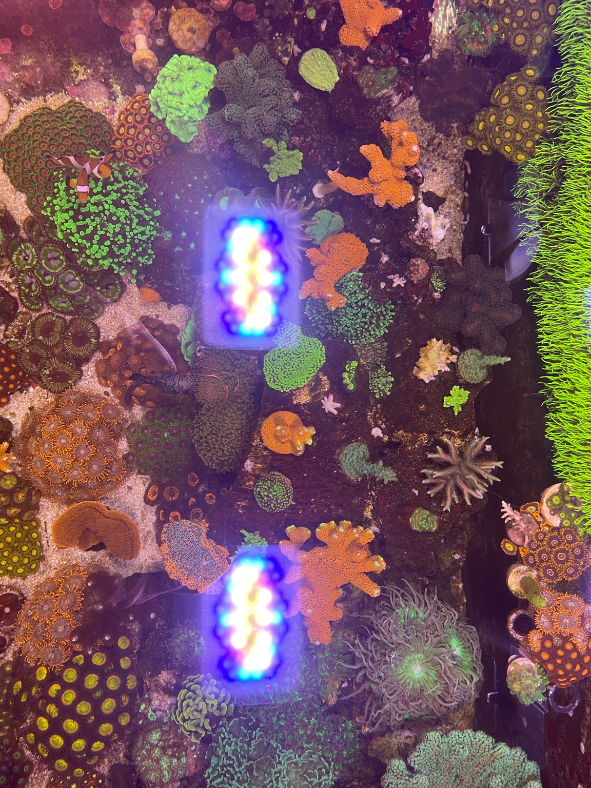 Один светильник лед бар перекрывает?Из новостей хочу добавить немного света, тестирую лед бар от орфек риф дей плюс, интересная картинка получилась с двумя радионами в пресете АВ+