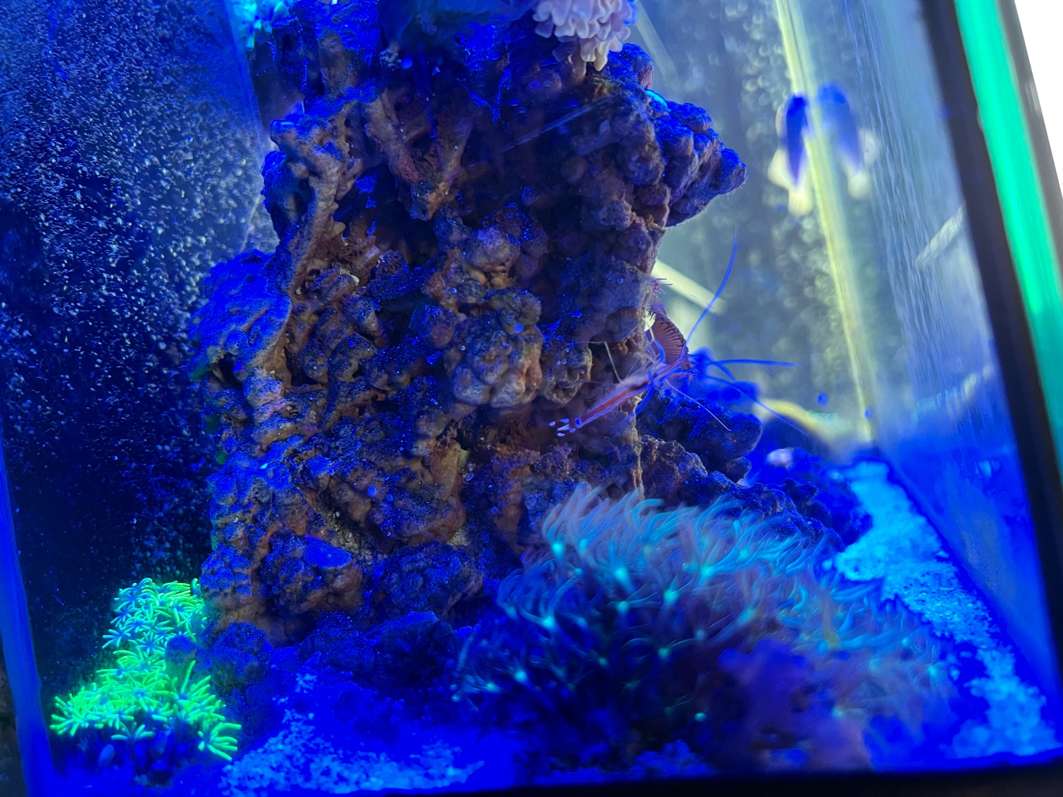 Креветка прячется сутки, сидит в одном месте, вчера охотно покушала Артемии. А вот мандаринка сегодня уже смелее
