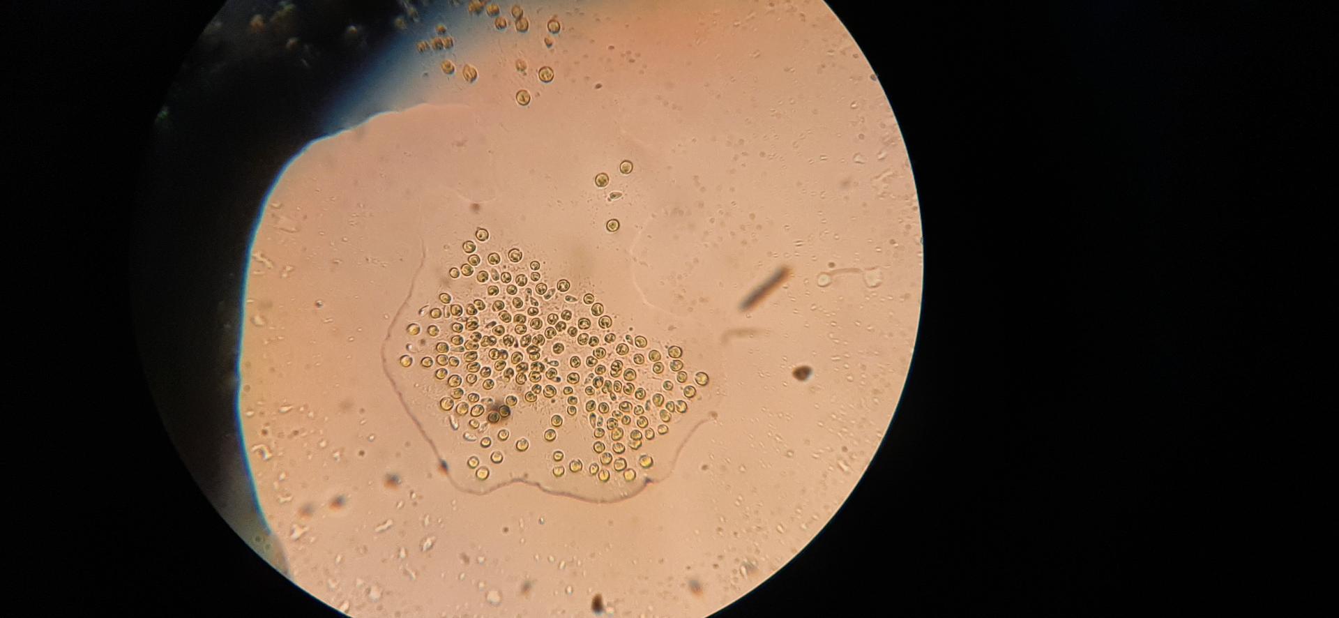 На вид похожи на дино. Под микроскопом не двигаются. Предпологаю хризофиты