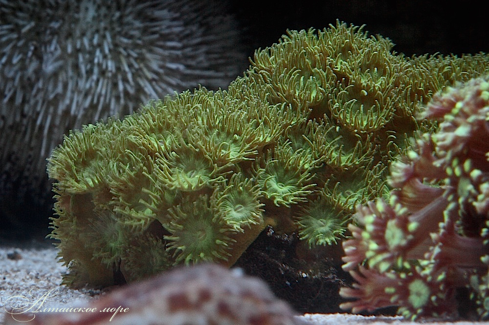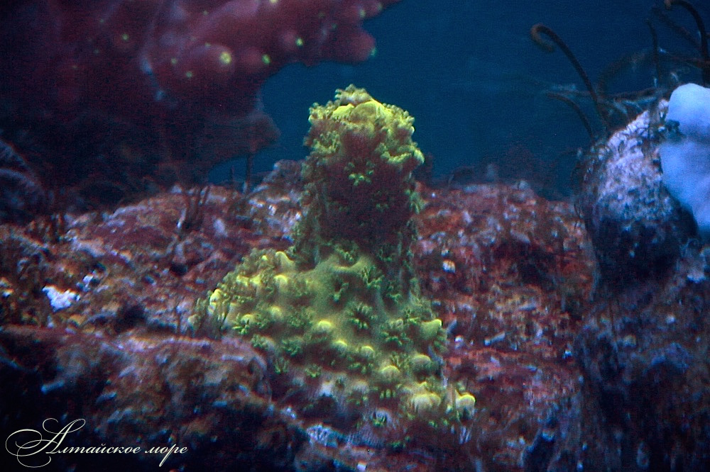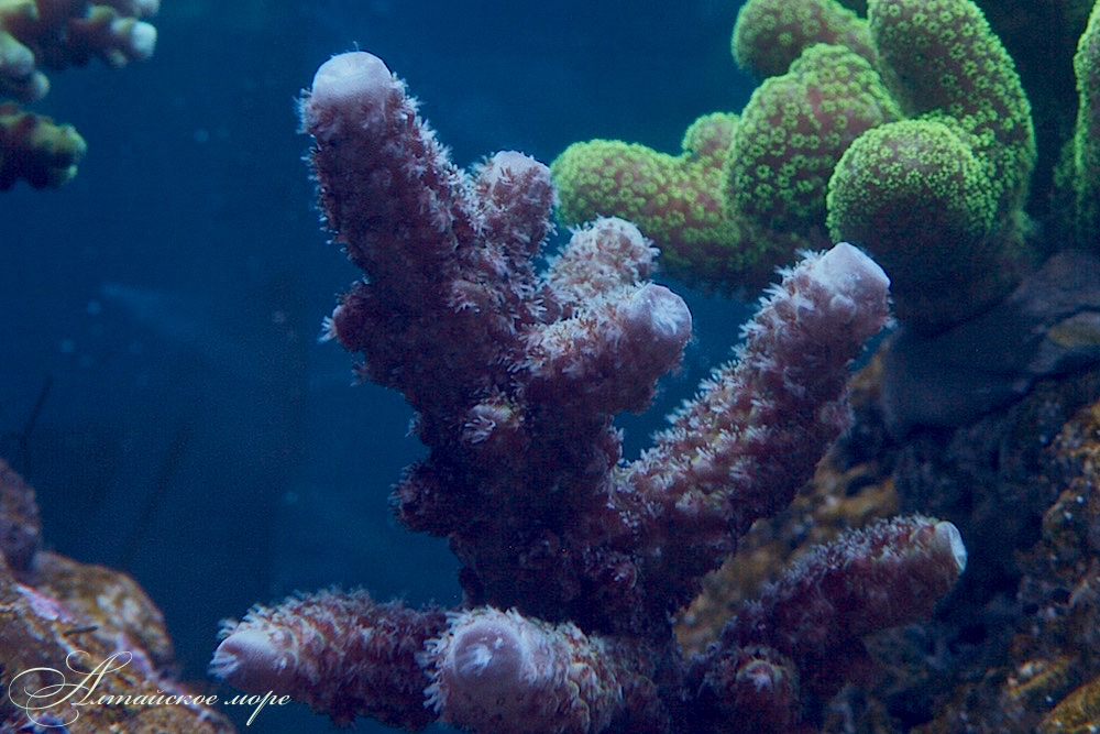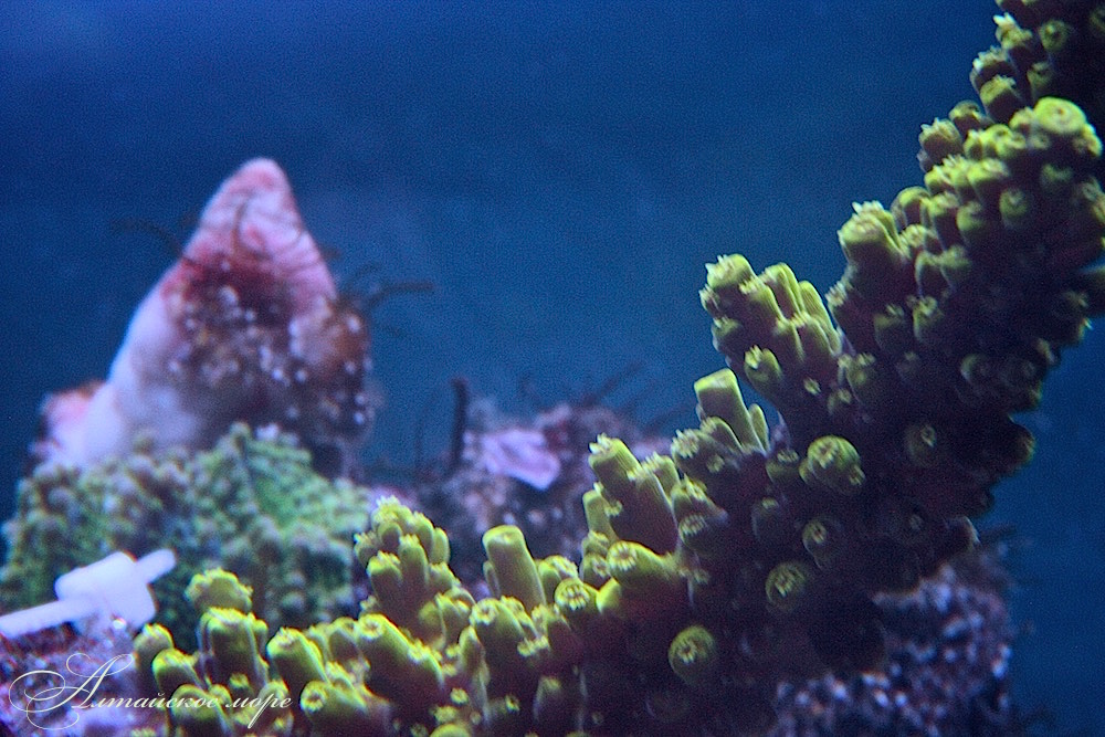 На 2м - она по ночам выпускает полипы. Но не сильно. Толстые веточки и вот такие розеточки 6-ти лучевые малюсенькие. На этом корале живут какие-то червяки веерные, которые выпускают антенки как локаторы. Прикольные.