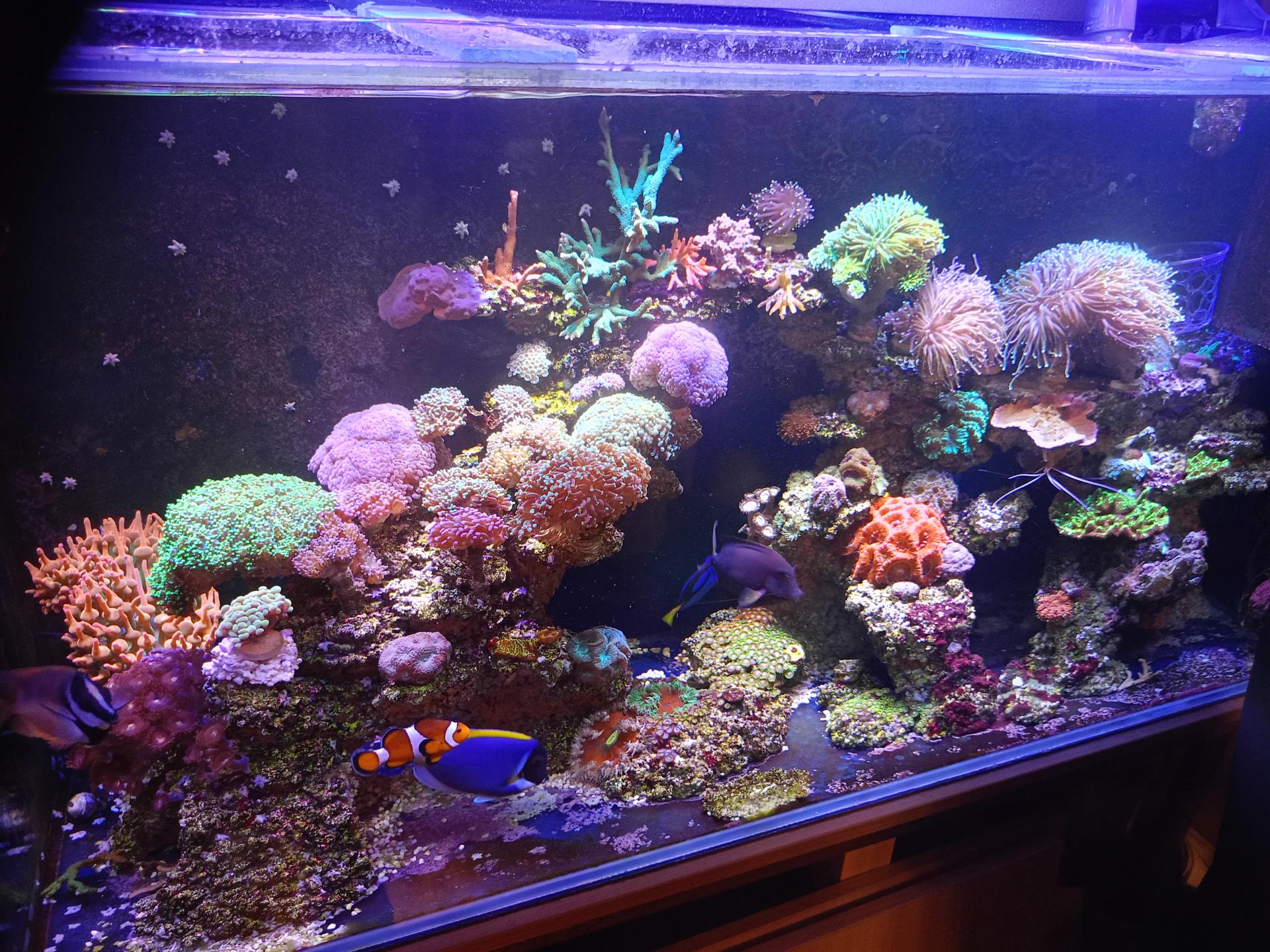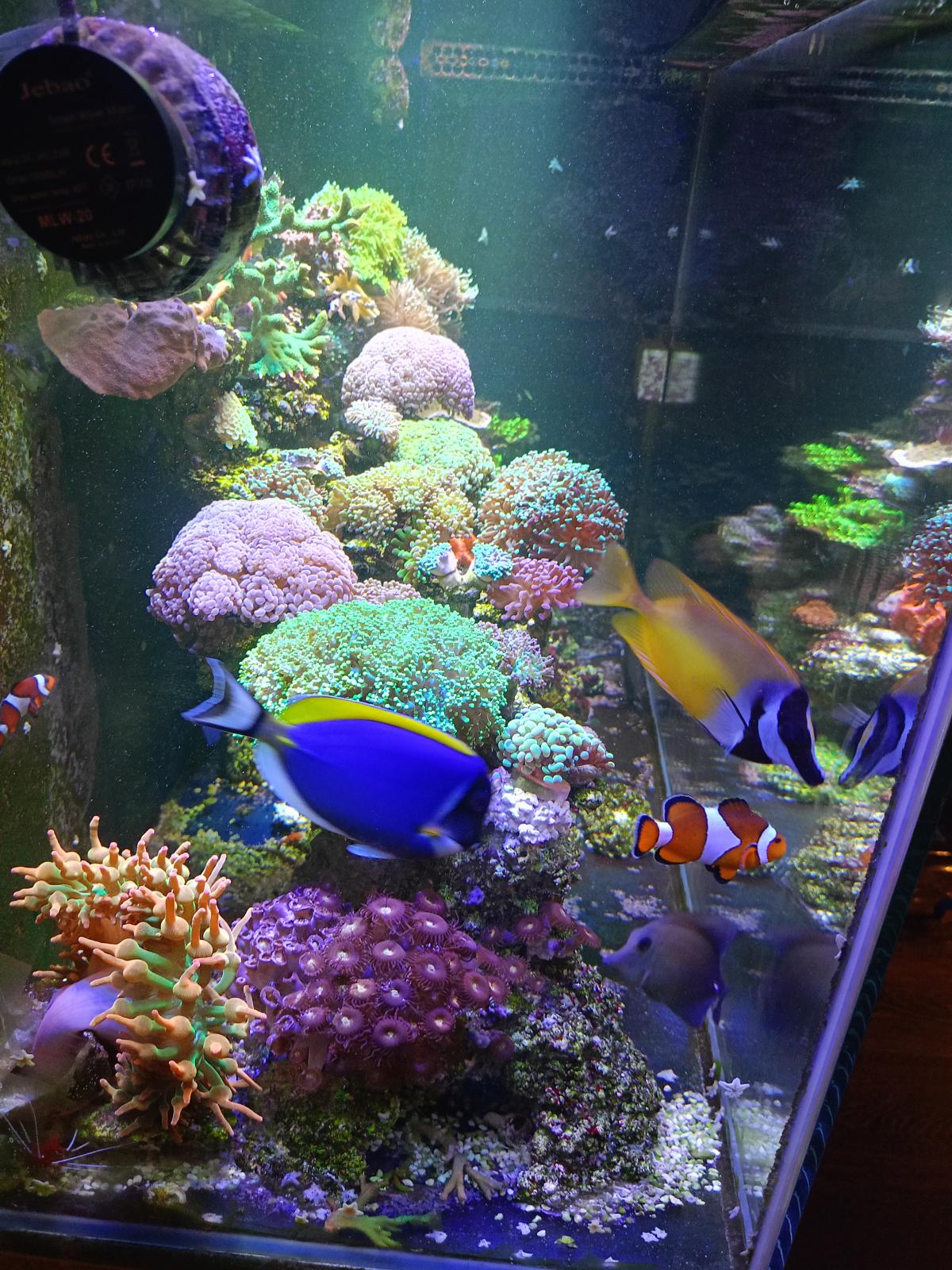 Помимо основного, запустил миник на внешнике JBL 900 . Стоял в кладовке 15 леть, тьфу тьфу запустился и пашет. Аквариум стоит в комнате у сына(он его считает СВОИМ!)Там живность проще:Крупный (отсаженный с основной банки)клоун+два маленьких оцеляриса. Две желтопузых хризиптеры и креветка доктор. Была потеря мандаринки,(сильно перегружал аквариум живой артемией), скорее всего погибла от асфексии. По кораллам: покупал в этот аквариум все по 500рублей за фраг. 2 эуфилийки мелких,4 вида зонтов , ксения, бриариум, клавулярия , капнелла и бедолага гониопора с основного аквариума.Гониопоре тяжело... помимо того, что попала в условия не очень сбалансированные, так у нее более 50% полипов были повреждены. Просидела 4е дня не вылезая, но сейчас по чуть чуть прибавляет. Из тех7-8 сантиметровых полипов, которые имела , начала вылезать на 1-1.5см и обрастать "щупальцами "вокруг рта полипа. Этому аквариуму сейчас 3 месяца, так же идет стадия циано, причем лютого, все фиолетово бурое.