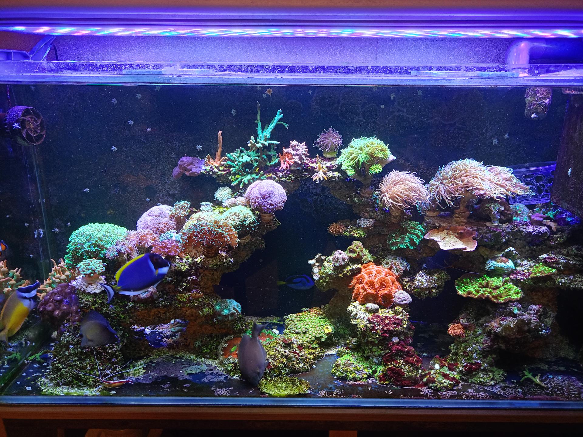 Всем , доброго времени суток! Решил оживить свою тему, так как прошло достаточно времени после последнего выхода на связь. Так сказать для истории ,и себе на память. На сегодня аквариум тьфу-тьфу жив. Сказать, что я поддерживаю постоянный баланс в аквариуме, как бы я этого не хотел, думаю не уместно. КН стараюсь поддерживать на уровне 7.5 за счет Биорифа от марисоли. Подмены все же пришлось увеличить. Раньше менял 35 литров раз в две недели. Сейчас 50 литров раз в неделю. Основная причина, повышение фосфатов. По мимо подмен , добавляю глицерин по 5мл . в день. Скачков по фосфатам не избежать, к огромному сожалению.