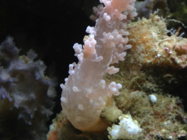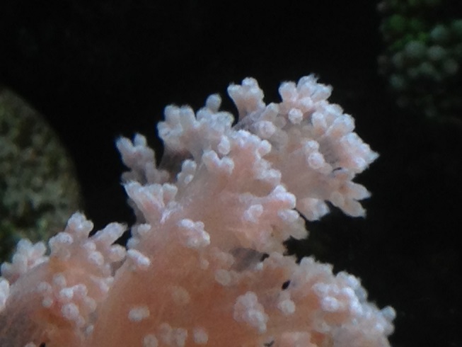 Кораллы нежно-розового цвета, тело на просвет прозрачное, особенно в основании. Ярко выраженных склеритов в теле на просвет не видно, видно какие-то опоясывающие белые тонкие "пояса".