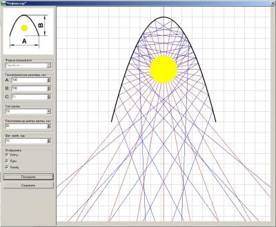 Строит прямые (красные) лучи от лампы (считаем лампу за точечный источник света) до рефлектора и отраженные (синие) лучи (в том числе множественные отражения).