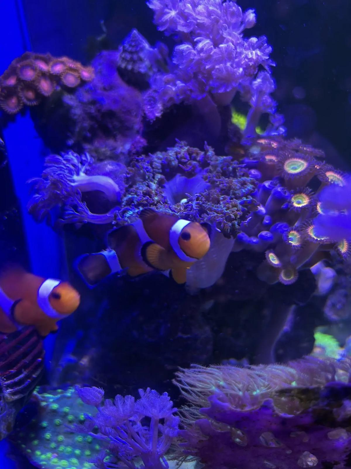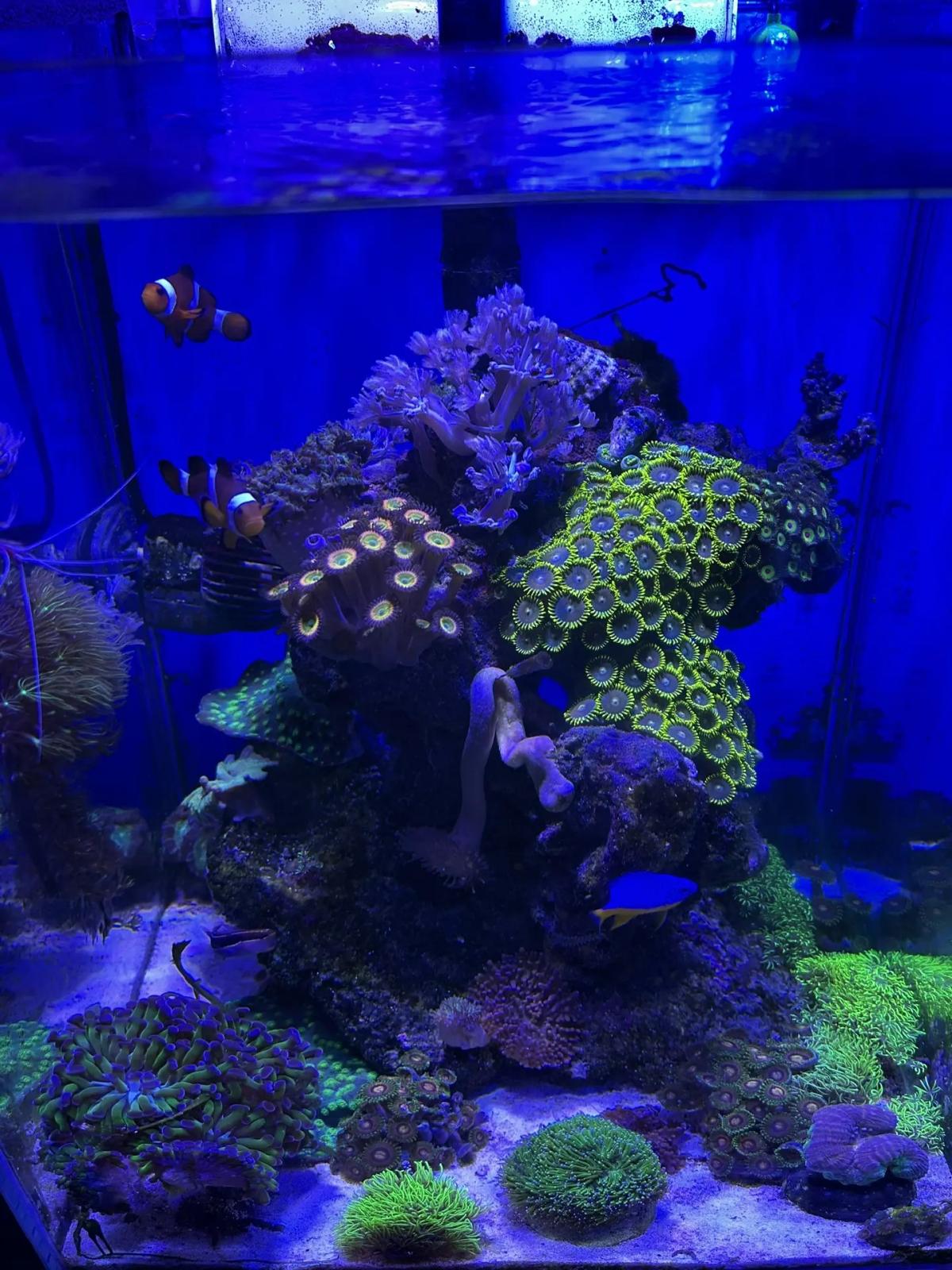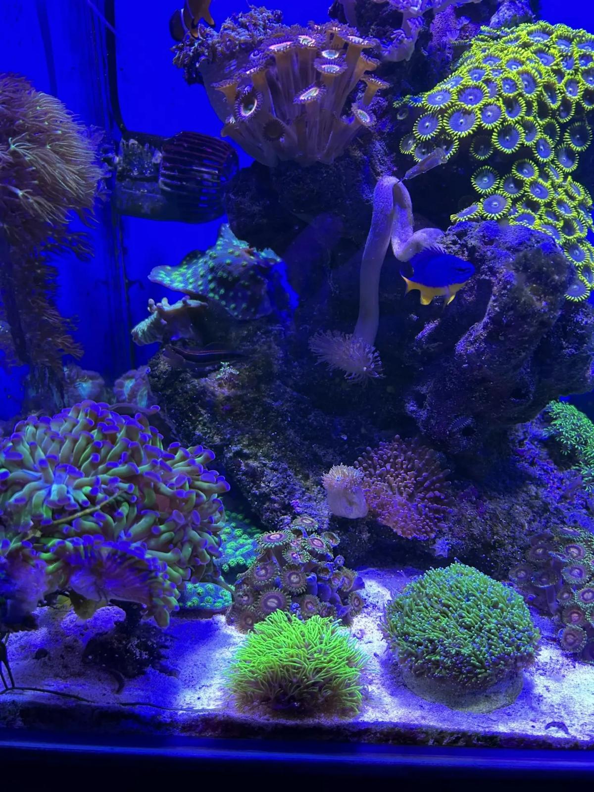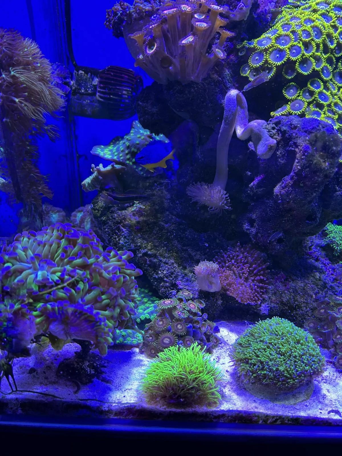 Сейчас вот так. Удалось справиться с дино. Никак не могу избавиться от анемона, точнее отдаю деток, но он достаточно быстро делится. Хочу заменить на зеленую ковровую мини актинию, нашел где раздобыть за вменяемые деньги. Жду сезонного подешевления креветок секси, пока очень дорого.