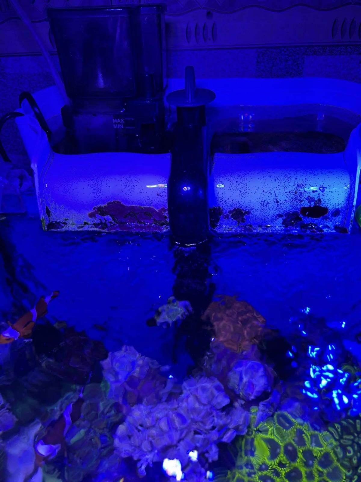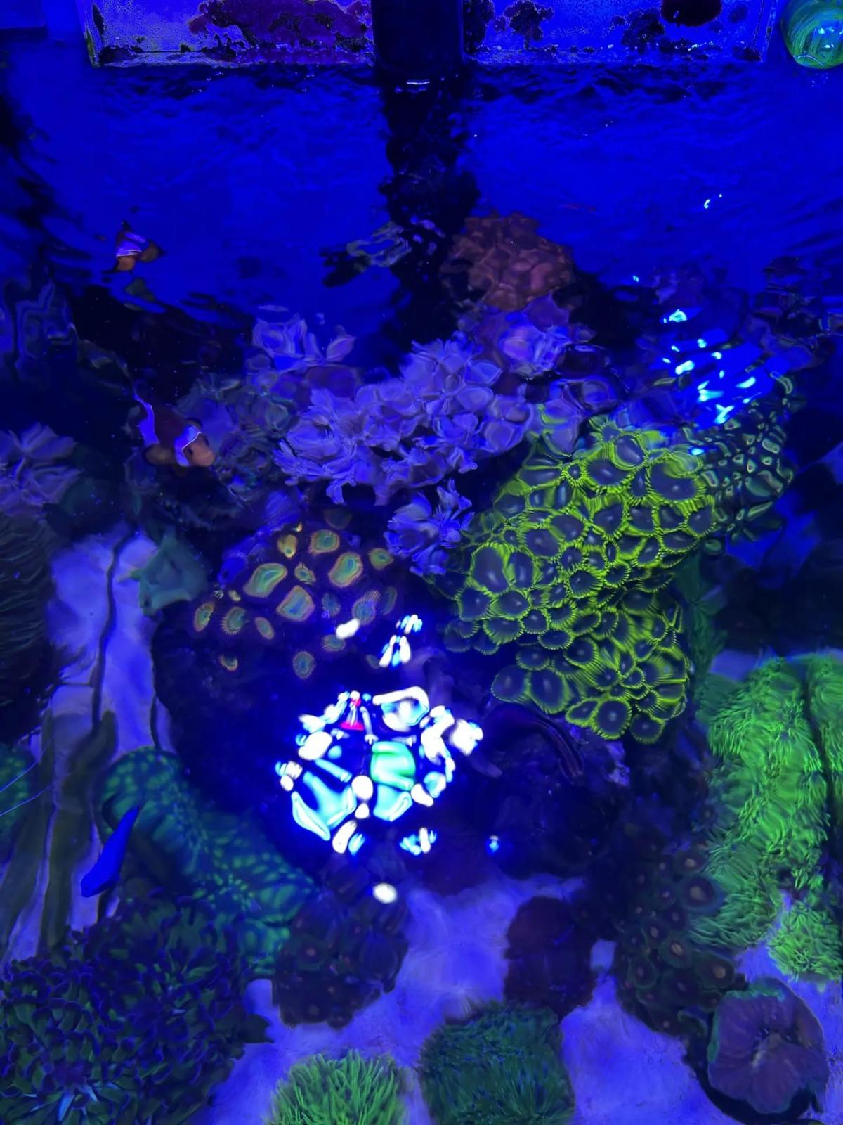 Фото перед выключением света. С дино тьфу-тьфу пока без проблем, их практически нет (чуть видно на верхушках камней, но явно стагнируют). Умерла лисмата, но я её покапал уже старой, а после этого год прожила. Думаю избавиться от собачки, обкусывает кораллы. Долго выхаживал монтипору сетозу, так она её за вечер погрызла. Покусывает лобофилию. Так что нифига не риф сейв она. Приобрёл пару сексиков и нериту. Теперь надо ехать за лисматой и кем-то на мену собаки. Если кому собачка разлинованая нужна пишите.