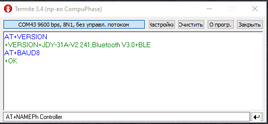 При проблемах (нет реакции на AT команды) можно также подключиться к порту блютуски (по блютусу - предварительно добавить блютуску как блютус устройство в windows) вторым окном Termite и смотреть, транслирует ли туда блютуска текст, введенный в первом окне терминала (на порт USB адаптера). Если выдает кракозябы - значит настроить скорости. При этом, если блютуска подключена по блютусу, то AT команды не выполняются, а просто транслируются по воздуху по блютусу. То есть, для выполнения AT команд, надо отключить второе окно терминала.