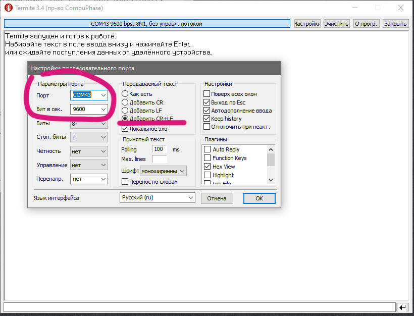 надо вбить номер порта переходника и текущую скорость блютуски, обычно 9600. И обязательно опцию "добавлять CR+LF).